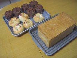こんばんは。今日はちょっち曇りがちで、お昼前にさあっと通り雨。ちょっちだけお買い物に行きたかったので雨が降り始めた時はどうしようかと思ったのでスが、じきにやんだので何とか出かけられてホッ。10月に入ってからこっち何となくせわしなくて、何だか日々全力疾走状態のような気がするあこ茶でス……マアお出かけと言っても、コンビニと(サンデーとマガジンを買いたかったのでス)100円ショップに(箱とプレゼント用の袋を買いたかったのでス)行きたかっただけなのでスがね。無事必要なものを買えて良かったでスよそして帰ってからパンやらお菓子やらをがーっと作り始めましたでス。途中ブー太郎くんのお迎えに行って、外で遊びたいと言うのを1時間半だけ待って!と待ってもらって出来上がったのがこちらでございまス。(出来上がった後ちゃんと自転車の練習に付き合いましたでス)マフィンカップのがありがとうショコラ、桜の花びらがのっているのが粒あん入りベーグル、そして四角いのはライ麦粉入り生クリーム角食でス。ありがとうショコラはチョコレートの濃厚な味わいが素敵でお気に入り、ベーグルは久し振りに作りましたでス。暑い時季は茹でる作業が辛いので、つい遠ざかってしまうのでスが、これからの季節は作りやすいでスね生クリーム角食はライ麦粉を加えて、何となく健康志向に(オホホホホ)。ちなみにこれらは、贈り物でス。先日:*・゜★はなもも.★.:*・さんからキリプレを頂いたので、そのお礼なのでございまス~明日発送しまスので、ちょっちだけお待ち下さいね~自作のパンを贈るのって正直ドキドキするのでスが、喜んでいただけると良いなあと思うあこ茶でス