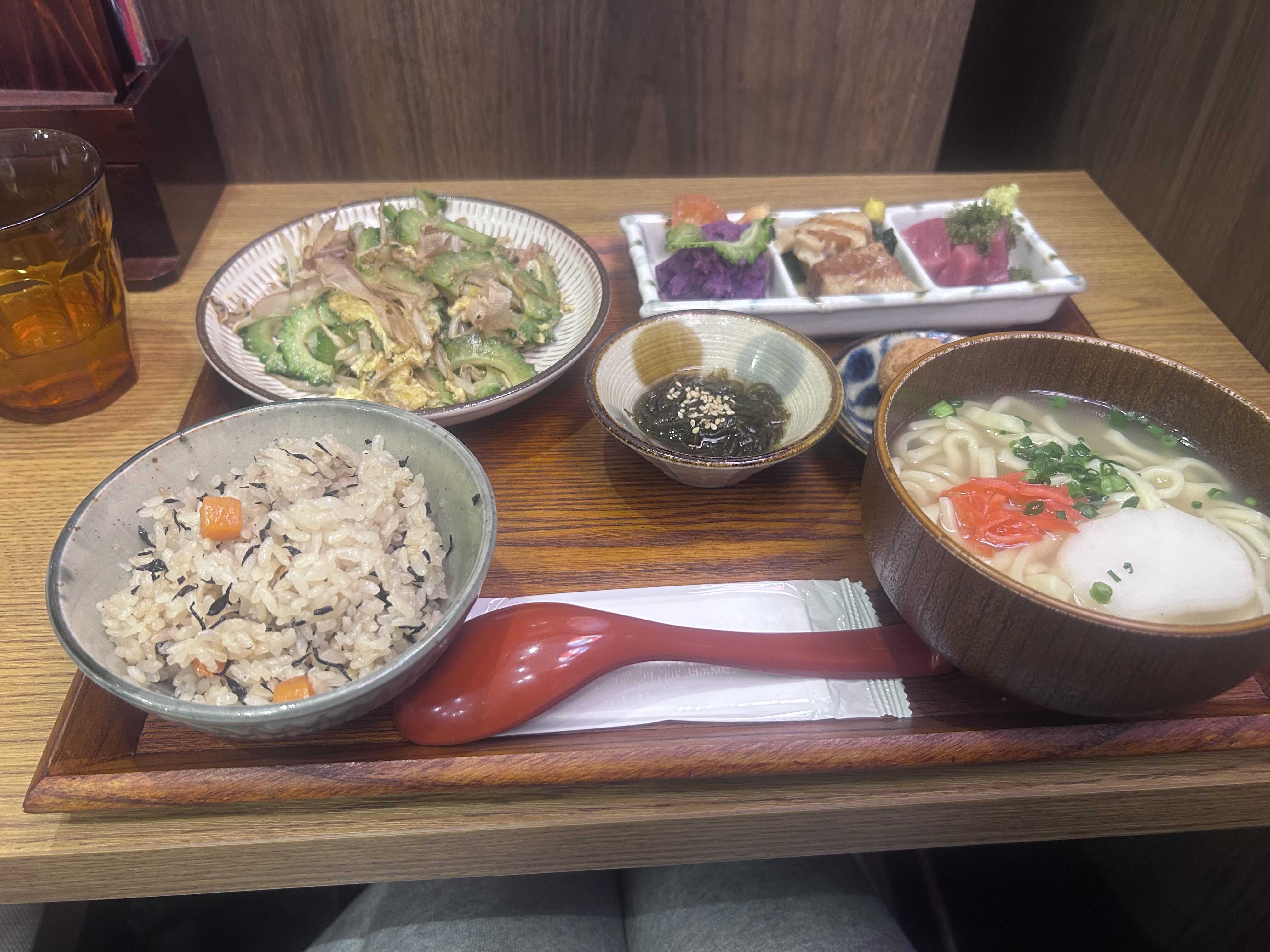 おはようございます😃今日のランチは、沖縄料理のちゅら屋ちゅら屋の美食膳・琉球つまみ3 品盛り(紅イモのポテトサラダ/ ラフテー/ まぐろのブツ) ・沖縄もずくの酢の物 ・ゴーヤチャンプル(ハーフ) ・ジューシー(沖縄の炊き込みごはん) ・沖縄そば(ハーフ) ・デザート/サーターアンダギーゴーヤチャンプルと沖縄そばが美味しかったお店のBGMも沖縄の曲がかかっていて、のんびりとしたランチになりました。お冷の代わりにさんぴん茶なのもうれしい昨日から食べ過ぎでお腹がでてきたので、今日の夜は軽めにしようと思いますドトールの月一の10%OFFの日コーヒー豆と新発売の珈琲羊羹を購入しましたでは、またね👋