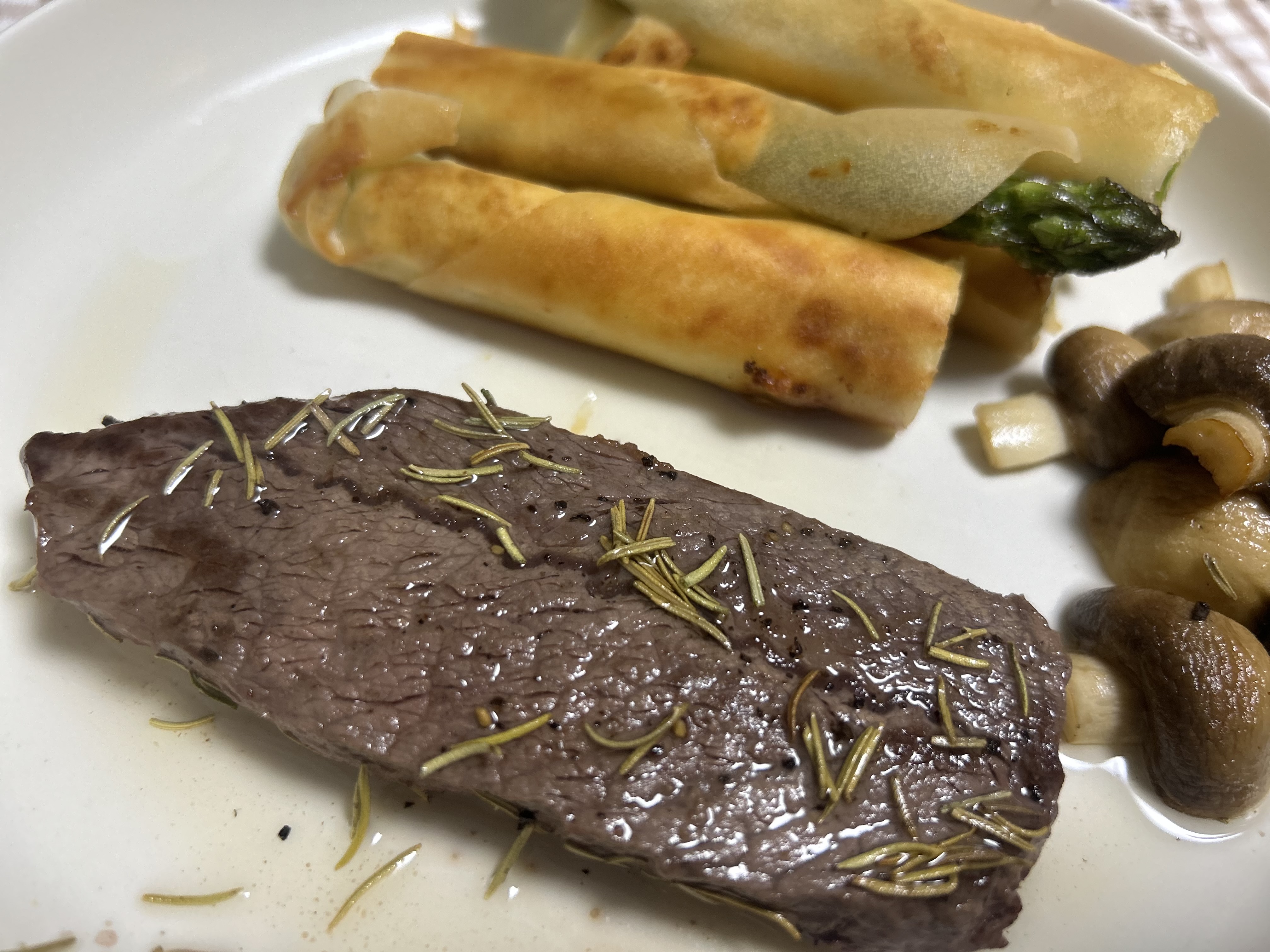 ステーキには、アクセントにローズマリーを、アスパラ春巻きには、クリームチーズとディジョンマスタードを入れて。