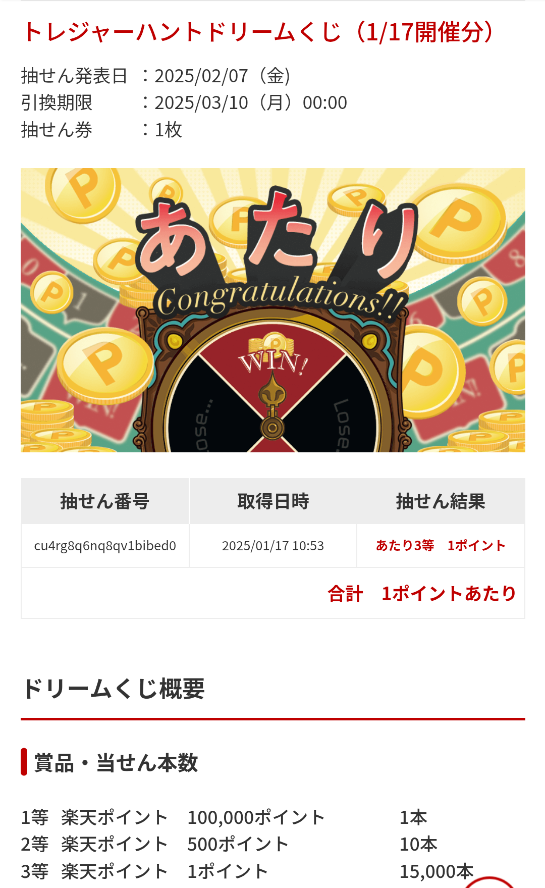 トレジャーハントドリームくじ(1/17開催分)トレジャーハントドリームくじ(2025年第1回) | 楽天ポイントモールまたは直はこちら