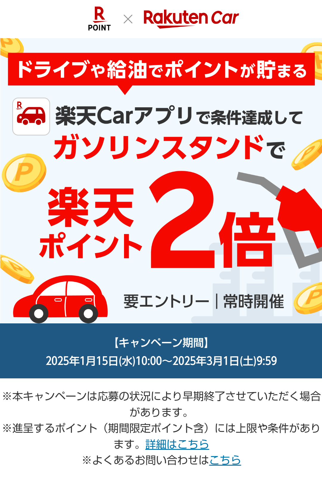 【楽天Carアプリ】条件達成で、楽天ポイントカードのガソリンスタンドでの利用がポイント2倍