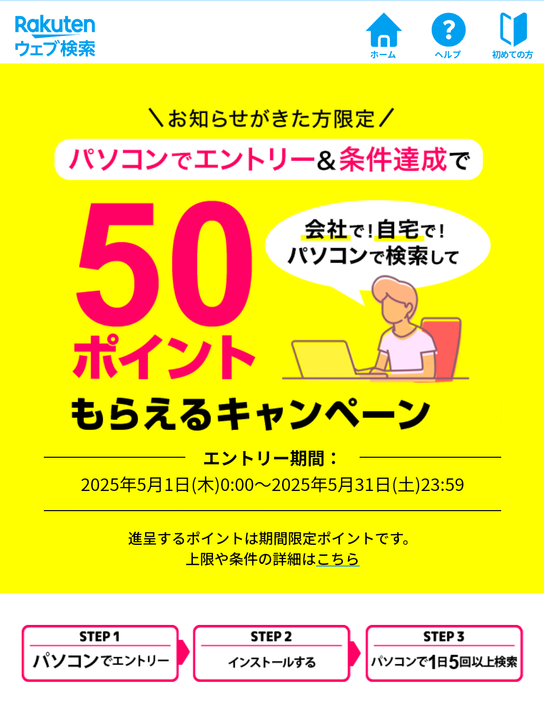 楽天ウェブ検索|メッセージを受信した方限定!パソコンで検索して50ポイント進呈キャンペーン