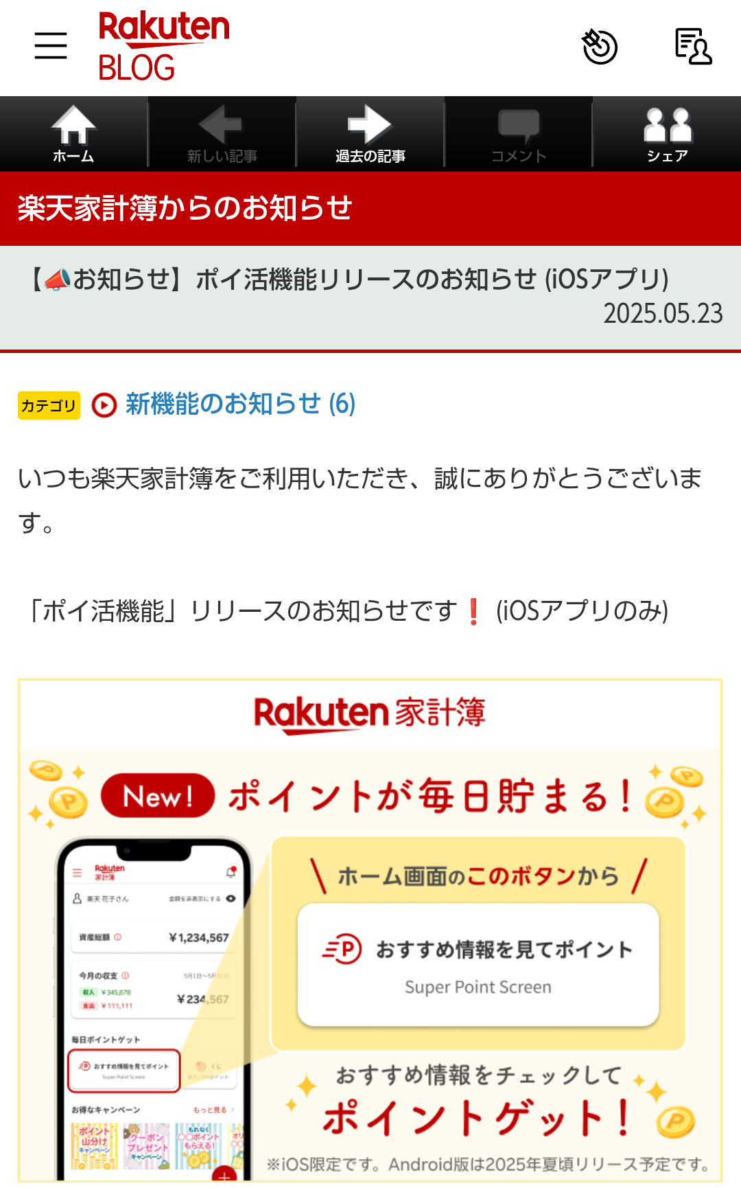 iphone7じゃダメか?と思ってse2引っ張り出してセットアップしました❗️けど、あとからiphone7で出来ました。🥸要アップデート、バージョン2.018時以降推奨?appストア【📣お知らせ】ポイ活機能リリースのお知らせ (iOSアプリ) | 楽天家計簿からのお知らせ - 楽天ブログ