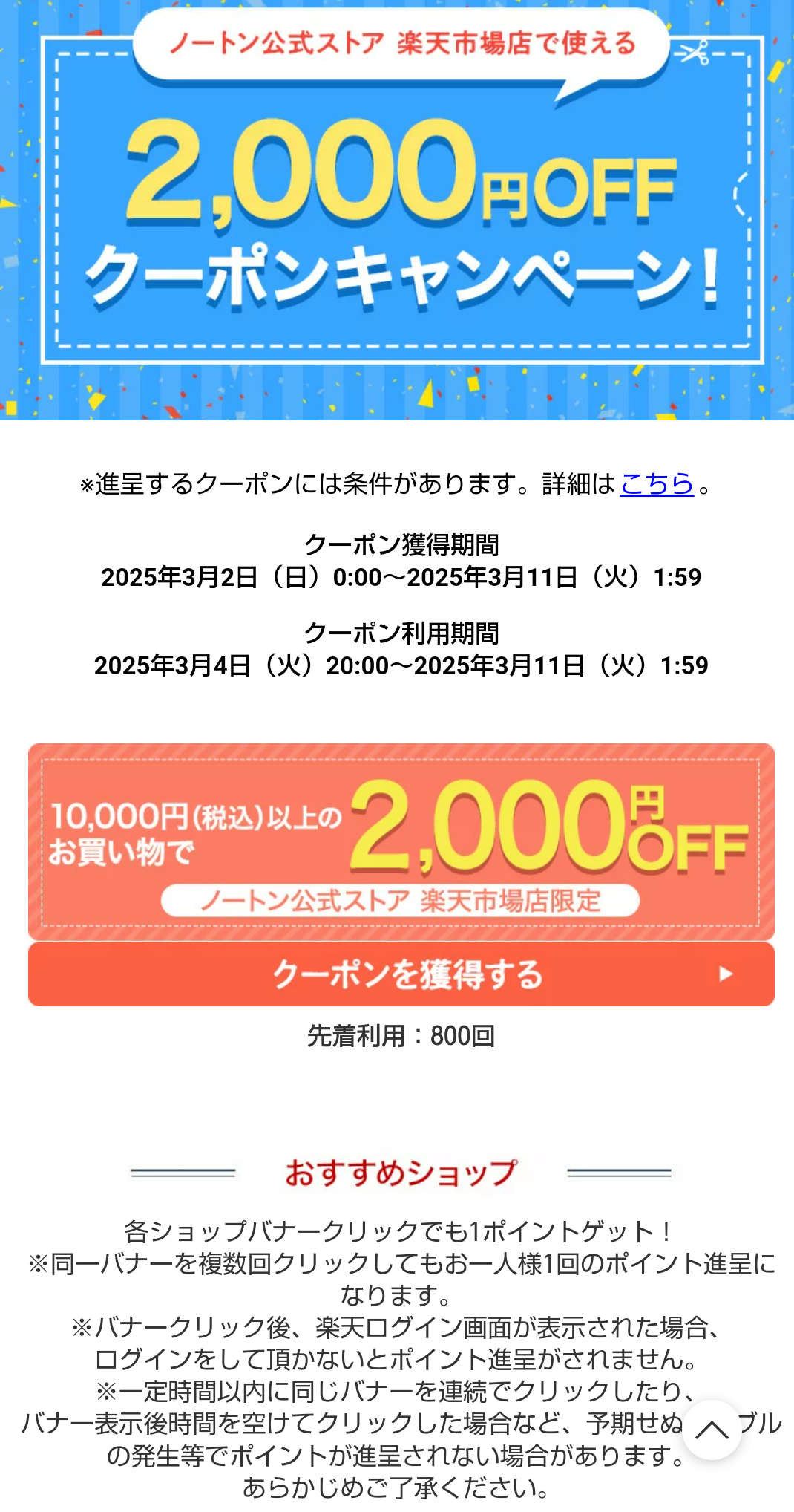 対象ショップで使える最大1,000円OFFクーポンキャンペーン! ノートン公式ストア 楽天市場店限定2,000円OFFクーポンキャンペーン!!