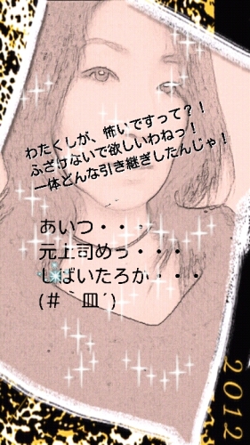 にほんブログ村今日は まったりとPC中毒症状 全快で?1日中 PC三昧Σ(●´゚д゚ノ)ノマヂヵョッ!!で 突然 携帯が鳴ったのでちょい 不機嫌に?電話に出ると・・・例の気の弱そうな新しい担当くんからの電話・・・「あのお忙しいところ すみません! えぇ~と・・・」別にっ・・・私 今日は仕事休みですし~忙しないっての・・・「で 早速ですが・・・ 私が事前に確認等してなかったのが 悪いのですが ○○の処理は~・・・」と 仕事の指示をするのを忘れていたのでどういう風に処理なさいましたか?ってな感じの話しなんですがもうね・・・「すみません」「申し訳ありません」が 多いっちゅ~ん!どんだけ 私のこと怖いねん!Σ(゚Д゚驚ノ)ノ・・・・。その他でも「あの まだ確認して無いので 失礼なこと言ってしまったら 本当にすみません! ○○~のことなんですが・・・」「あ~ それですか? これこれ こうこうしましたよ」「はっ!わかりました! それでは 今から確認致します!」あまりにも 下手に出られるとやり難くてしょうがない・・・疲れるわっ・・・┓(゚Å゚ ) ┏意味不明・・って・・・考えられるんは・・・あいつ・・・そう 元上司・・・あいつが・・・きっと・・・めちゃくちゃ言いやがったな・・・もうね・・・こうなったら・・・トコトン いじめて あ・げ・る♪冷ややかな人を馬鹿にしたようなこの顔で・・・(爆)楽しみwwwヾ(楽´∀`楽)ノwww♪サブブログ1 アメーバブログ『アラフォー主婦のたわごと。。。』サブブログ2 FC2ブログ『頑張れ!アラフォー主婦♪』こちらも、よろしくです♪