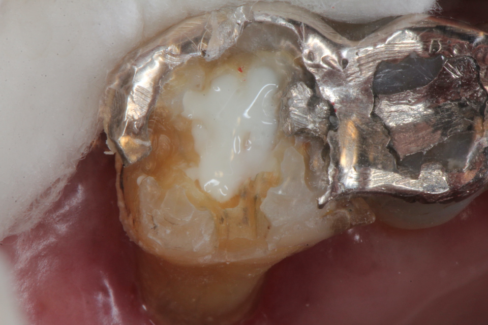 CRで漏洩しないようにカバーして終わり。これで痛みや強烈な沁みは消失する。こんな簡単なことで歯髄炎が治るとか信じられないかもしれないが、これが事実だ。冠を被せるまで何度も患者を通わせるなどという患者を苦しめる必要はない