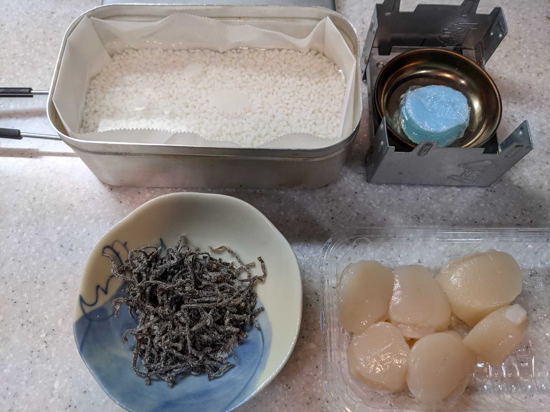 11月5日(金)放送の『沸騰ワード10』は、伝説の家政婦・志麻さんにて、「塩昆布とホタテの炊き込みご飯」ってのをやっていて、塩昆布とホタテを入れて炊くだけとのことだったので、キャンプ飯にいいなあと思い、早速作ってみた。とはいえ、ホタテの刺身が500円ほどだったので、良いホタテを買うとそこそこの値段になった。では、作りましょう。お米は、すでに研いで水につけておきました。米は1合、塩昆布は、12g、ホタテは刺身用6個。作り方は超簡単。塩昆布を満遍なく米の上に乗せ、その上にホタテを乗せる。蓋をして火を点ける。固形燃料は、20gはだいたい20分くらい火がついてます。これで自動炊飯できます。火が消えたあと、タオルにくるみ10分ほど蒸らします。蓋を開けるとほら。出来上がり。ホタテが、縮んでしまいました。(泣)でも、塩昆布だけで、これだけ色のついたご飯が炊けてます。茶碗によそり、いただきます。