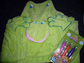 昨日から風邪を引いていて、今朝も、イマイチの調子・・・風邪薬を飲んで、一眠りした後に少し元気が出て来たので、珍しく天気が良いし、J-bearも、外へ行きたそうだったので、ドライブがてら、ちょっと遠めの巨大スーパーへ行くことにこれと言って、買う予定は無かったのですが、スーパーをありとあらゆる所を見ました(←暇人)。3月にの友達の息子がお誕生日で、たまたま、可愛い物をスーパーで発見カエルバスタオル&ミトンとバスクレヨン 既にこの息子の為に絵本を1冊買っていて、他に何か一緒にあげれないかとあれこれ考えていた矢先、このスーパーで上のグッズを発見色々な動物のバスタオルがあったのですが、色的に、このカエルちゃんのが一番目を引きましたカエルの顔(バスタオルの角)がちょうど帽子になっていて、バスタオルを体に巻きつけられるようになっています。そして、バスタオルにカエルの手が付いているのにも、笑えましたっ写真の真ん中に写っている子ガエルは、ミトンになっていて、お風呂に入る時にこれにソープを付けて、体をゴシゴシ可愛すぎる・・・写真の右手に写っているのは、クレヨンなのですが、お風呂用で、お風呂の壁にこのクレヨンでお絵描きが出来るというワケです。で、お湯で消せるみたいです。お家に帰って来て、この上の写真を撮って、マジマジとこのカエルバスタオル&ミトンを見ていたら、自分も欲しくなってきちゃいました・・・自分にも、1個、買えば良かったかな・・・(爆)既に買ってある絵本は、抹茶も同じ本を買って、学校で既に子供達に読んでいます早速、絵本と上のグッズを包んで、友達の息子の為に送りたいと思います気に入ってくれるかないつも、クマちゃん大好きっ子ですが、今日は、カエルにやられました・・・タオルをどうぞ かえるさん/かえるグッズ【エンタメ0222_2】とっても愛嬌のある表情がたまりません♪アニマル オーブン ミット カエルカエルが返すから安心なんですっ!!マーナ(MARNA) グッチ裕三。 うまいぞぉシリーズ よく...フロッシュとスポンジワイプ、カエルポンプにゴミ箱までついたお得なセット!《HAPPYセット》TH...かえるさんの洗濯ばさみ