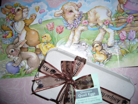 約2週間後には、イースター(復活祭)早々と、抹茶クラスのとある生徒のママさんからイースタープレゼントを頂いちゃいましたイースターらしく・・・写真後ろの方に写っているイースターカードは、抹茶が購入した物ですJ-bearママにこのカードをあげようと思ってこういう、ちょっとレトロちっくなカード好きですもらったは、ぷち卵カートン・・・イースターだから、”イースターエッグ”のよう・・・うずらの卵チョコイースターエッグにちなんでか、”うずらの卵チョコ”でした最初の写真のチョコの札に書いてある英語がわかった方なら、中に何が入っているかすぐわかったでしょう英語で"quail"(クエイル)とは、”うずら”という意味なのです。それにしても、リアルちっくなうずらの卵チョコだっ確か、去年も、これ頂いて食べたような・・・チョコが口にとろけて美味しかったと思いますエッググッズを見つけてみましたALESSI [Coccodandy]ゆで卵ホルダー(イエロー) コクヨ たまごみたいなステープラー たまほっち【エンタメセール0303】たまごキャンドル(みどり)(雑貨)PROVINCIAL エッグホルダー【超得0310】コッコクック レンジでゆでたまご電子レンジで一度に4つもゆで卵ができる!