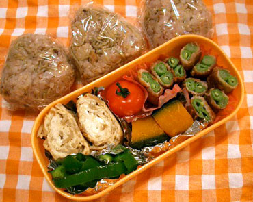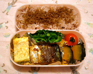 ***今日のお弁当***いんげんの豚肉巻きかぼちゃの煮物えのき入り卵焼きピーマンソテーミニトマト小女子とごまのふりかけ************************いんげんはさっと塩ゆでして豚肉で巻き、小麦粉をまわりにつけて軽く押さえ熱したフライパンで炒めて、塩、こしょうで味付け。かぼちゃの煮物は昨日の夜のおかずです。鍋にかぼちゃを入れて砂糖を加え1分ほど菜箸で転がしながら炒めます。こうするとホクホクかぼちゃになるし、煮くずれ防止にもなります。次にだし汁を加えてしばらく煮ておしょうゆを加えます。この段階でおべんとう用は汁ごと取り分けておき、今朝仕上げました。えのきは2cmほどに切って、だし汁、酒、おしょうゆで煮てあります。卵にこのえのきを混ぜて卵焼きにしました。ピーマンはサラダ油で炒めて、塩、こしょうで味付け。小女子はごま油で炒って、砂糖少々とおしょうゆで味付けし、最後にすりごまを加えてふりかけにし、ご飯に混ぜました。ご飯は、胚芽米に12穀米を1合につき大さじ2杯入れてます。水は胚芽米の分量のお水に雑穀米分のお水をたします。雑穀米大さじ2杯の時は水大さじ4杯をたし、塩少々加えて炊いてます。