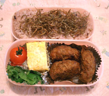 ***今日のお弁当***ハンバーグスライスチーズ入り卵焼きピーマンソテーミニトマト小女子とごまのふりかけ************************4月から娘が高校生になりました。入学式はまだですが今日は準備会&試験でお弁当を持って行きました。ハンバーグは昨日の夜ご飯のおかずです。お弁当がいる時は最初からお弁当サイズで全部作って途中でソース共々別に取り分けておきます。朝煮込みハンバーグにして最後にソースもからめておきます。卵焼きは定番のスライスチーズ入りです。スライスチーズはとろけるタイプではなく普通のを使います。こちらの方が冷めてもおいしいのです。ピーマンは塩、コショウで味付け。小女子はフライパンにごま油を入れ軽く炒ったら砂糖少々、おしょうゆで味付けし最後にすりごまを加えて出来上がり。焦げやすいので手早く作ることがポイントです。