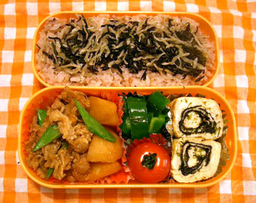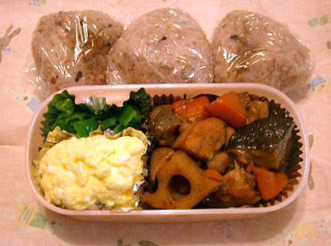 ***今日のお弁当***いり鶏(筑前煮)スライスチーズ入りスクランブルエッグピーマンソテー肉味噌入りおにぎり************************入学式も無事終わり、今日から授業がスタートしました。昨日の夜のおかずはいり鶏でした。材料は鶏もも肉、こんにゃく、レンコン、にんじん、シイタケです。すべて一口大に切って、こんにゃくは下茹でしておきます。鍋にサラダ油を入れて熱し鶏肉を入れて炒めます。鶏肉の色が変わったらこんにゃく、レンコン、にんじんを入れて炒め最後にシイタケを入れて炒め、砂糖を加えて更に炒めます。砂糖を使う煮物を作る時、まず砂糖を入れて1分ほど炒めてから他の調味料を入れるようにしています。こうすると味がしみ込みやすく煮くずれ防止ににもなります。酒、だし汁を加えてあくを取りながら煮て、おしょうゆを加えます。この、材料がまだ固いかなという段階でおべんとう用に汁ごと取り分けておき、今朝みりんを加えて仕上げました。今回はごぼうがなかったので入れてないのですがごぼうが入るとさらにおいしいです。タケノコも入れたり、彩りにきぬさやを入れたりもします。スライスチーズはとろけるタイプではなく普通タイプのものを使います。こちらの方が冷めてもおいしいのです。卵1個に対してスライスチーズ1枚使い、塩少々入れスクランブルにします。チーズの塩気だけでも十分なのでほんのすこ~しだけです。ピーマンはサラダ油で炒め塩、こしょうで味付け。肉味噌は合挽き肉とねぎで作ります。合挽き肉をフライパンで炒めます。私はこの時油はひかないで肉の脂だけで炒めます。肉に火が通ったら味噌を加えてさらに炒め砂糖、酒で味付けし、最後に小口切りにした小ねぎを加えます。ネギはたっぷりめの方がおいしいです。この肉味噌はおにぎりに入れても、そのままアツアツのご飯にのせても千切り野菜と合わせてレタスで包んでもおいしいです。肉だけでなく魚でもできます。祖母は残った焼き魚や煮魚の身をほぐして魚味噌をよく作ってました。私も鯖の味噌煮が残ったときなど魚味噌を作ります。こちらもおいしいですよ。