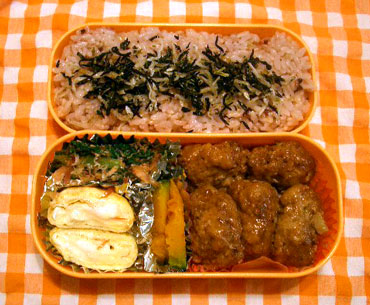 ***今日のお弁当***豚肉団子(餃子の残りで)ブロッコリーしらすとおかかふりかけ混ぜ卵焼きスィートかぼちゃ味のりふりかけ********************昨日の夜餃子を作りました。中の具材は豚ひき肉、白菜、小ねぎ、ごま油、酒、みりん、しょうゆ、塩、こしょうです。多めに作って残りでお弁当用の肉団子を作るつもりにしていたのでニラを使わず小ねぎを入れました。ニラだとお弁当の時においがちょっと気になるらしいのです。餃子の残りそのままでも良かったのですが、昨日はそれに卵とパン粉を加えて肉団子を作りました。肉団子の形はいつものようにお弁当用はボール型ではなく、ちょっとつぶれた団子型です。朝それをしょうゆ、酒、砂糖、水で甘辛く煮て、最後に水とき片栗を加えてからめました。ブロッコリーはさっと茹でて水分をペーパーで軽くとって、アルミカップに入れてスライスチーズをのせ、オーブントースターでチーズに軽く焼き色がつくまで焼きました。ブロッコーリーは茹でると栄養分が流れ出ちゃうので電子レンジで加熱する方が良いらしいのですが、電子レンジですると柔らかくなりすぎたり固かったりと、いまいち上手くできないので茹でて使ってます。オーブントースターで加熱することを考えて固めに、さっと茹でるのがポイントです。スライスチーズはとろけるタイプではなく普通のものです。こちらの方が冷めてもおいしいのです。卵焼きはシラスとおかかで作ったふりかけを混ぜ込んでます。おかかはお味噌汁のだしをとった残りです。これを軽くしぼって粗く刻んでごま油で炒め、砂糖少々、おしょうゆで 味付けしてシラスを加え最後にすりごまを混ぜたものです。ラップに包んであるのがスイートかぼちゃです。これはスイートポテトのかぼちゃ版のようなものです。かぼちゃは薄くスライスしてつぶれるくらい柔らかく茹でます。水分を飛ばした後、砂糖 少々、バター少々、牛乳少々を加えて練って、固めのこしあんくらいに仕上げます。さました後ラップで茶巾絞りのように包んで出来上がりです。今日は隙間があまりなかったのでつぶれた形になっちゃいました。