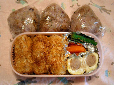 ***今日のお弁当***揚げないコロッケいんげんごま和えにんじんウインナー入り卵焼きちりめんじゃことごまのふりかけまぜご飯のおにぎり********************揚げないコロッケは、熱したフライパンにバターを入れパン粉をきつね色になるまで炒めてまわりにつけたコロッケで、脇雅世さんの『毎日ムリなく手早くおべんとう』ー講談社ーという本に載っていたレシピです。何回も作っているので分量とかは結構適当になってます。レシピではハムを使っているのですが今回はベーコンと玉ねぎで作りました。ベーコンの方がコクがあってよいのですが油っぽくなるのでベーコンを炒めた後キッチンペーパーで少し油をとってから玉ねぎを炒めました。ベーコンと玉ねぎを昨夜炒めておきました。今朝それをレンジで温め、茹でてつぶしたじゃがいもと合わせ塩、こしょうで味を整え(ベーコンの塩味があるので塩は控えめ)おべんとう箱に入れやすい形に作り、きつね色に炒めたパン粉をまわりにつけました。コロッケの中身に直接パン粉をつけるのでちょっとポロポロしますが私はラップを使って軽く押さえるようにしてつけてます。パン粉をつける時には適度に油分があった方がつきやすい気がしてベーコンを炒めた後に余分な油をとる時あまりとりすぎないようにしています。写真では分からないのですが側面におしょうゆをたらしてあります。中身にけっこうしっかり味がついているのでほんの少しだけです。昨夜作ったベーコンと玉ねぎの炒め物は多めに作り半分はこのコロッケに、残りは冷凍しました。卵焼きに入れたり、他の料理に使ったりできます。いんげんは茹でてごま和えに。にんじんは昨日のかぼちゃと同じように7~8ミリに切ってひたひたのお水とバター少々、塩少々で柔らかくなるまで煮て最後水分を飛ばしてます。ウインナー入りの卵焼きは茹でたウインナーを真ん中にして卵焼きにしたものです。卵にはお塩を少々入れてます。これもウインナーの味があるのでお塩は控えめです。おにぎりにはちりめんじゃことごまのふりかけを混ぜ込んでます。土曜日はお弁当を食べる時間がちょっと短いので食べやすいように1つずつラップに包んでます。コロッケを大きく作りすぎたので他のおかずの量が少なくなっちゃいました。