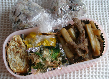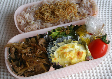 ***今日のお弁当***きんぴら牛ゆでたまマヨチーズ焼き小松菜のごまおかかあえスイートかぼちゃ茶巾絞りミニトマトシラスとごまのふりかけ************************ごぼうはささがきにして水にさらしてアク抜きをしざるに上げて水気を切っておきます。ごま油を熱したフライパンでごぼうを炒め、ごぼうがしんなりしてきたら牛肉を加えて炒め酒、砂糖、しょうゆで味付けをし、七味唐辛子、すりごまをふりました。卵を固ゆでにし、殻をむいて縦に二つに切ります。この時、ちょうど半分に切るのではなく6対4くらいの所で切ります。深い方は黄身を取り除いて器用にとっておきます。黄身と浅い方の白身をフォークなどでつぶしスライスチーズを細かくちぎって加えて混ぜマヨネーズ、塩、こしょうで味付けをし器用にとっておいた白身に乗せてオーブントースターで焼き色がつくまで焼きました。以前はマヨネーズだけでしたがスライスチーズを加えるとコクが出るので最近はスライスチーズを一緒に混ぜています。小松菜は熱湯でサッと茹で、食べやすい長さに切って水気を絞ってしょうゆ少々をかけてしばらくおきます。しばらくしてしょうゆが水っぽくなったらキッチンペーパーで押さえるようにしてしょうゆをふき取り新たにしょうゆ少々、砂糖少々で味付けをしてすりごま、かつお節であえました。かぼちゃは薄くスライスして柔らかくなるまで茹でお湯を捨てて、から煎りをし粉ふきいも状態にします。バター少々、牛乳少々、砂糖少々を加えて火にかけ水分を飛ばしながら練って固さを調節しラップに包んで茶巾絞りにしました。テフロンのフライパンでシラスをから煎りし砂糖少々、しょうゆで味付けをし、仕上げにごま油を少量たらして、すりごまを加えました。
