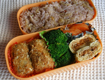 ***今日のお弁当***揚げないコロッケ肉味噌味ブロッコリーハンバーグソース入り卵焼きにんじんのグラッセえのき混ぜご飯************************昨日の夜、肉味噌を作りました。それを使って揚げないコロッケを作りました。じゃがいもはうす切りにして、塩少々を入れて茹で、粉ふきいも状態にしてつぶしておきます。肉味噌は適量を温め、つぶしたじゃがいもに混ぜます。肉味噌にしっかり味がついているのでコロッケの味付けはしなくて大丈夫です。あら熱が取れたら俵型に成形します。フライパンにバター少量を入れて火にかけ、パン粉を入れてきつね色になるまで炒めます。余熱でも色が濃くなるのでちょっと早めに止めお皿などに移しておくことがポイントです。きつね色になったパン粉の中に俵型に成形したコロッケを入れ軽く押さえるようにしてコロッケのまわりにパン粉をつけます。肉味噌はそのままご飯にのせて食べてもおいしいし、いろいろ料理にも使えて便利です。肉味噌をコロッケの具に入れるのは初めてだったのですがとってもおいしくできましたよ。味がしっかりついているので、しょう油などかけなくても良いしお弁当のおかずにおすすめですよ。ブロッコリーは塩少々入れた熱湯でサッと茹で水気をキッチンペーパーで押さえるようにして拭き、塩少々、こしょう、昆布茶で味付けしました。昨日のお弁当のハンバーグを煮込んだ後のソースを取り分けておきました。それを温め直して、塩少々入れた卵で卵焼きを作りハンバーグソースが真ん中になるよう焼きました。にんじんは5mmくらいの輪切りにしヒタヒタのお水、バター少々、塩少々で柔らかくなるまで煮て最後は汁気を飛ばして照りをだしました。先日作ったえのきの煮物の味を整え煮汁がほとんどなくなるまで煮つめて混ぜご飯にしました。