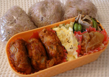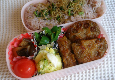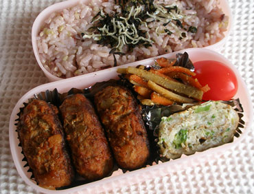 ***今日のお弁当***高野豆腐入りハンバーグゆで玉チーズマヨそら豆とハムのソテーえのきとじゃがいもの煮物シラスふりかけ混ぜご飯************************高野豆腐は50度くらいのお湯で戻し、しぼって水気を切ってから細かくちぎっておきます。合挽き肉、高野豆腐、たまねぎのみじん切り、卵、塩、こしょうをボールに入れて粘りがでるまでよくこねます。楕円形に成形したらサラダ油を入れ熱したフライパンで両面に焼き色がつき、中まで火が通るよう蓋をして焼き、ソースを加えます。ソースは、トマトケチャップ、有機野菜使用の濃厚タイプのソースを2対1で混ぜ白ワイン、水を加えてハンバーグの半分くらいが浸るよう作ります。ソースを加え片面1分ずつ煮込んだら火を止めハンバーグとソースを別々の容器に取り分けておきます。ここまで夜準備をして朝仕上げました。鍋に高野豆腐入りハンバーグとソースを入れ煮込み、ソースが少なくなったら焦がさないよう両面にからめます。卵は固ゆでにして殻をむき、フォークでつぶして細かくします。マヨネーズ、細かくちぎったスライスチーズ、塩を加えて混ぜアルミカップに入れ粗挽きこしょうをふってオーブントースターで表面に焼き色がつくまで焼きます。そら豆は塩少々入れた熱湯で約4分ほど茹で、薄皮をとっておきます。ハムは食べやすい大きさに切ります。熱したフライパンにサラダ油を少量入れ、ハムとそら豆を炒め塩、こしょうで味付けしました。じゃがいもは一口大に切り、水にさらしてアク抜きをします。エノキは3cmくらいに切ります。鍋にじゃがいもえのきを入れ砂糖少々をふって1分ほど焦がさないよう炒めだし汁、酒を加えアクを取りながら煮ます。煮立ってきたらしょうゆを加え、ひと煮たちして火を止め煮汁ごと器に入れます。(この段階ではじゃがいもはまだ固めです)ここまで夜準備をしておき、朝仕上げました。煮汁ごと鍋に入れ、じゃがいもがが柔らかくなって煮汁がほとんどなくなるまで煮て最後は汁気を飛ばします。テフロンのフライパンにシラスを入れ、シラスが少しカリッとなるまでから煎りをし、砂糖少々、しょうゆで味付けをし、ごま油をほんの少し入れ、最後にすりごまを加えます。炊きあがった雑穀米のご飯に混ぜ、おにぎりにしました。