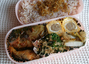 ***今日のお弁当***サバの味噌漬け焼きブロッコリーのおかかあえウインナー入り卵焼きレンコンとザーサイの炒め物シラスとごまのふりかけ************************サバは食べやすい大きさに切り塩を両面に軽くふって10分ほどおきます。10分ほどおくと水分が出てきているのでキッチンペーパーでしっかりふき取ります。ハチミツ大さじ1半、味噌大さじ1~1半をよく混ぜてサバにぬりポリ袋などに入れて冷蔵庫へ。前の夜にここまで準備をしておき、朝焼きました。味噌を軽くふき取ったサバをテフロンのフライパンに並べ蓋をして、両面に焼き色がつき、中まで火が通るよう焼きます。味噌はこげやすいのでちょっと注意が必要です。粗挽きウインナーは熱湯でサッと茹でておきます。卵に塩少々を入れ、ウインナーが真ん中になるよう卵焼きにしました。ブロッコリーは塩少々入れた熱湯でサッと茹で水気を切ってしょうゆ少々をかけてしばらくおきます。しばらくしてしょうゆが水っぽくなったらキッチンペーパーでふき取り新たにしょうゆ少々をかけ、かつお節であえました。レンコンは3cmほどのながさの縦切りにし水にさらしてアク抜きをしてざるにあげておきます。ザーサイは細切りにします。フライパンにごま油を熱してレンコンを炒めレンコンが透き通ってきたらザーサイを入れて炒め塩、こしょうで味付けしました。シラスをテフロンのフライパンで少しかりかりになるまで煎って砂糖少々、しょうゆで味付けをし、仕上げにごま油をほんの少したらしてよく混ぜ、すりごまを加えました。