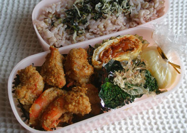 ***今日のお弁当***えびのごま焼きハンバーグソース入り卵焼きブロッコリーおかかあえチーズポテトひじきちりめんふりかけ************************えびは背わたを取って一口大に切り酒少々をふって5分ほどおきます。キッチンペーパーで軽く押さえるようにして水分を取ったら塩少々をふり、すりごまをたっぷりまぶし、オリーブオイルを熱したフライパンで蓋をして焼きます。高野豆腐入りハンバーグを作った時に取り分けておいて冷凍保存していたハンバーグソースを温め、あら熱をとっておきます。卵に塩少々入れてハンバーグソースを真ん中にして卵焼きにしました。ブロッコリーは塩少々入れた熱湯でサッと茹で水気を切ってしょうゆ少々をふってしばらくおきます。しばらくしてしょうゆが水っぽくなったらキッチンペーパーでふき取り新たにしょうゆ少々をかけ、かつお節であえました。じゃがいもは薄くスライスして、下味がつくくらいの塩を入れて茹でます。箸でさして割れるくらい柔らかく茹でたら湯を捨て粉ふきいも状態にし、スライスチーズをちぎって入れて混ぜ合わせラップに包んで茶巾絞りにしました。