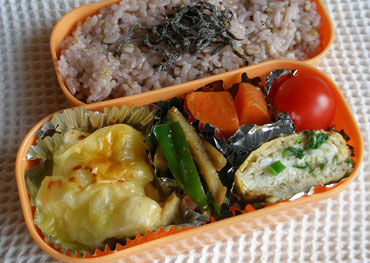 ***今日のお弁当***鶏肉のチーズ焼きレンコンとピーマンのきんぴらシラスとネギ入り卵焼きにんじんのスープ煮ミニトマト塩昆布************************昨日の夜のおかずに手羽先を使ったポトフを作りました。その時にお弁当用に手羽先、じゃがいも、にんじんをスープごと取り分けておきました。手羽先は骨をとって身をほぐしておきます。じゃがいも、ほぐした手羽先をひたひたのスープで煮て、煮汁がほとんどなくなったら塩、こしょうで味を整え、アルミカップに入れてスライスチーズをちぎって乗せオーブントースターで焼き色がつくまで焼きました。にんじんもスープで煮て、最後は汁気を飛ばして照りをだしました。レンコンは3cmくらいの長さの縦切りにします。いちょう切りに切るより縦切りの方が食感が好きです。ピーマンは細切りにします。ごま油を熱したフライパンでレンコンを炒めレンコンが透き通ってきたらピーマンを入れて炒め酒、砂糖少々、しょうゆで味付けをし七味唐辛子、すりごまをふりました。卵にシラスと、小口切りにした小ねぎ、昆布茶少々を入れて卵焼きにしました。