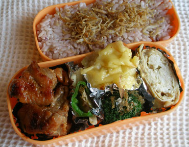 ***今日のお弁当***鶏もも肉の味噌漬け焼きレンコンとピーマンの炒め物じゃがいもとにんじんチーズ焼きブロッコリーのおかかあええのき入り卵焼きシラスとごまのふりかけ************************鶏もも肉は一口大に切っておきます。ハチミツ大さじ1半、味噌大さじ1~1半を混ぜ合わせ鶏肉をその中に入れてよく揉み込んでポリ袋に入れて冷蔵庫へ。前の夜にここまで準備をしておき、朝、焼きました。温めたテフロンのフライパンに皮の方から鶏肉を入れ両面に焼き色がつき中まで火が通るよう蓋をして焼きました。じゃがいもは一口大に切り、にんじんは2cm角くらいに切りコンソメ、塩少々でかために煮ます。夜ここまで準備をしておき、朝、スープごと火にかけ塩、こしょうで味を整え、にんじんが柔らかくなるまで煮て汁気を飛ばします。アルミカップにじゃがいもとにんじんを入れスライスチーズを適当な大きさに切って乗せ、オーブントースターでチーズが溶けて少し焼き色がつくまで焼きました。ブロッコリーは塩少々入れた熱湯でサッと茹で、水気を切ってしょうゆ少々をかけてしばらくおきます。しょうゆが水っぽくなったらキッチンペーパーで押さえるようにして拭き、新たにしょうゆ少々をかけ、かつお節をたっぷり入れてあえました。エノキは3cmくらいの長さに切っておきます。鍋にえのきを入れ、ひたひたのだし汁、酒、砂糖少々、しょうゆを入れアクを取りながら煮て、冷ましておきます。卵にこのえのきを適量、煮汁ごと入れて卵焼きにしました。シラスはテフロンのフライパンで炒め少しカリッとなったら砂糖少々、しょうゆを加えてよく混ぜ最後に香り付けにごま油を少量入れてすりごまをたっぷり入れました。