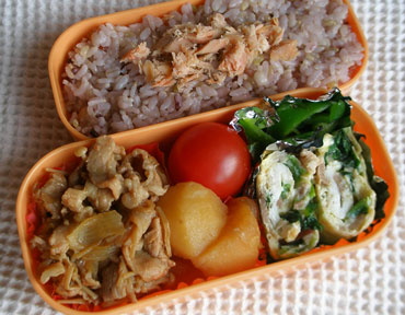 ***今日のお弁当***えのき入り肉じゃがハムと小松菜入り卵焼きピーマンソテーミニトマト鮭フレーク************************豚うす切り肉、たまねぎ、えのきは食べやすい大きさに切り、じゃがいもは一口大に切って水にさらしておきます。フライパンを熱して豚肉を炒め、たまねぎ、えのき、じゃがいもを入れて炒め、砂糖少々をふって全体になじむよう炒めます。砂糖を先に入れて炒めると甘みがよくしみ込むし、煮くずれ防止にもなるそうです。ひたひたのだし汁、酒を入れてアクを取りながら煮て煮立ったらしょうゆを入れひと煮立ちさせて火を止めます。夜ここまで準備して(この段階ではじゃがいもはまだ固めです)朝仕上げました。じゃがいもが柔らかくなり煮汁が少なくなったら火を強めて焦がさないよう汁気を飛ばし、全体をからめます。ハムは小さめに切ってフライパンでさっと炒めておきます。小松菜は熱湯でサッと茹で、細かく切って水気を絞っておきます。卵にハム、小松菜、塩少々を入れ卵焼きにしました。ピーマンは1cm幅くらいに切ってサラダ油で炒め塩少々、こしょう少々、昆布茶少々で味付けしました。