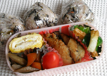 ***今日のお弁当***サワラの味噌漬け焼きちくわとピーマンの炒め物ごぼうとニンジンの甘辛煮スライスチーズ入り卵焼きミニトマトひじきちりめん(明太子高菜味)混ぜご飯************************サワラは食べやすい大きさに切ります。味噌、砂糖、酒で甘味噌ダレを作りサワラの両面に塗り、ラップで包むかポリ袋などに入れて冷蔵庫へ。前の夜にここまで準備をして、朝焼きました。ちくわは3cmくらいの長さの細切りにし、ピーマンも同じように切ります。ごま油を熱したフライパンでちくわとピーマンを炒め、塩、こしょうで味付けしました。ごぼうは乱切りにして水にさらしてアク抜きをし、水気を切っておきます。ニンジンも乱切りにします。鍋にごぼうとニンジンを入れ、だし汁、砂糖、酒を加えてアクを取りながら煮ます。煮立ってきたらしょうゆを加えて1~2分煮て火を止め煮汁ごと器に入れて冷蔵庫へ。前の夜ここまで作っておき、朝、煮詰めて全体をからめました。卵に塩少々を入れ、スライスチーズを巻き込んで卵焼きにしました。