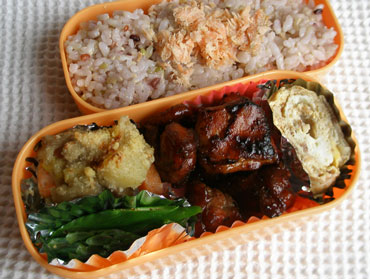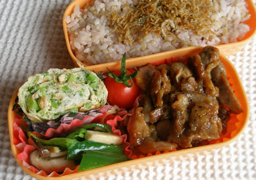 ***今日のお弁当***豚肉とブナシメジの味噌炒めにんじんのグラッセシラス入り卵焼きブロッコリーエゴマ入り高菜漬け************************豚うす切り肉は食べやすい大きさに切ります。味噌、砂糖、豆板醤、酒、水で甘辛味噌ダレを作っておきます。熱したフライパンで豚肉を入れて炒め(油は入れずに豚肉の脂だけで炒めます)豚肉が少しカリッとしてきたらブナシメジを入れて炒めブナシメジがしんなりしてきたら甘辛味噌ダレを加え全体をよくからめ、汁気を飛ばします。にんじんは5~8mmくらいの輪切りにします。鍋ににんじんを入れ、ヒタヒタの水、バター少々、塩少々を入れにんじんが柔らかくなるまで煮て、最後は汁気を飛ばしてツヤを出します。卵にシラスとほんの少しの水(出来上がりがかたくならないように)を入れて卵焼きにしました。ブロッコリーは塩少々入れた熱湯でサッと茹で水気をふき取ってから塩、こしょう、昆布茶、香り付けにごま油をほんの少し入れて味付けしました。エゴマ入りの高菜漬けも福岡物産展で買ってきた物です。ピリ辛でおいしいですよ。