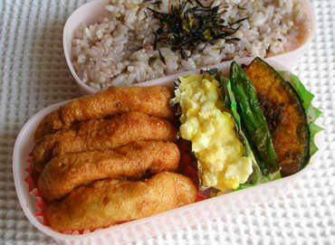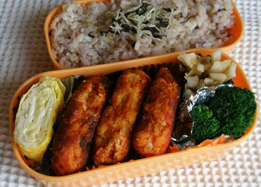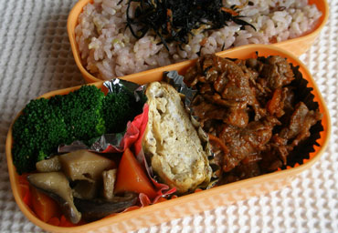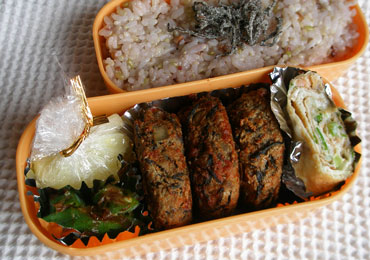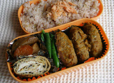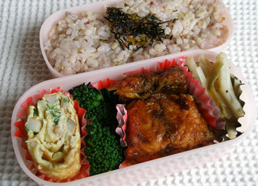 ***今日のお弁当***煮込みハンバーグさやいんげんのソテーひじきちりめん(明太子高菜味)入り卵焼き根菜の甘辛煮鮭フレーク************************昨日のお昼にナチュラルハウスのルウを使ってハヤシライスを作りました。お弁当用にそれの残りで煮込みハンバーグを作りました。合挽き肉、豚ひき肉、たまねぎのみじん切り(生のまま)、卵、塩、こしょう、ナツメグを粘りがでるまでよく混ぜ、小判型に成形し、フライパンで両面に焼き色がつくよう焼きました。そこへハヤシライスの残りを少し水でのばして入れ煮込みます。ひと煮たちしたら火を止め、冷めてからルウごと器に入れて冷蔵庫へ。前の夜に作っておき、ルウごと一晩置くと味がよくしみ込みます。朝、温め直し、少し煮込んでルウをからめました。斜め切りにしたさやいんげんは塩少々入れた熱湯でサッと茹で、サラダ油を熱したフライパンで炒め、塩、こしょうで味付けしました。ひじきちりめん(明太子高菜味)混ぜごはんのもとを卵に混ぜ卵焼きにしました。昨日の夜のおかずに手羽先と根菜の甘辛煮を土鍋で作りました。その時にお弁当用に根菜を煮汁ごと取り分けておき朝温め直し、最後は焦がさないよう全体をからめました。***手羽先と根菜の甘辛煮(土鍋で)***手羽先は火が通りやすいよう1カ所切れ目を入れておきます。ごぼうは乱切りにし水にさらしてアク抜きをし、水気を切っておきます。ニンジンもごぼうに大きさをそろえて乱切りにします。タケノコの水煮も同じように乱切りにし、レンコンは1cmくらいのいちょう切りにします。(ごぼうなどと同じくらいの大きさで)材料を全部ボールに入れ、砂糖、酒、しょうゆを加えて混ぜ調味料が全体に行き渡るようにします。土鍋に調味料ごと全部入れて蓋をして火にかけます。最初は強火で、蓋の穴から湯気が出てきたら弱火にして10分ほど、火からおろしてバスタオルなどで包んで保温して10分で出来上がりです。材料から出る水分と調味料だけでも大丈夫なのですが一番下の材料が焦げることもあるので水50~100ccくらいを調味料に足したり、途中でふたを開けて上下を入れかえ焦げないようにしたり(この時に材料の火の通り具合をチェック)します。************土鍋は熱がじんわり伝わるので材料のうまみが出ておいしく仕上がるし、余熱を利用して作れるので光熱費の節約にもなるし、保温力も優れているのでいつまでも温かく食べれるし・・・などなどとっても良いですよ。最近気に入ってよく使います。最初は使い方が悪くって焦がすことが多かったけど最近は工夫して少し上手に使えるようになりました。