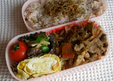 ***今日のお弁当***きんぴら豚エリンギとピーマンのソテーチーズ入り卵焼きミニトマト小女子とすりごまのふりかけ************************きんぴら豚はきんぴら牛の豚肉版です。ごぼうとニンジンはピーラーでささがきにしてごぼうは水にさらしてアク抜きをして、水気を切っておきます。フライパンにごま油を熱して、ごぼうとニンジンを炒め酒、砂糖、しょうゆで味付け。ここまで夜作っておきました。朝牛肉とあわせて味付けをするので、この段階での味付けは薄味です。朝、フライパンにごま油を少なめに入れて熱し、豚肉のうす切りを炒め、夜作っておいたごぼうとにんじんのきんぴらを加えて、酒、砂糖、しょうゆを足して味を整え汁気を飛ばしてからめました。エリンギは食べやすい大きさの短冊切りにしピーマンも同じように切ります。サラダ油を熱したフライパンでエリンギとピーマンを炒め塩、こしょう、昆布茶で味付けしました。スライスチーズは折って棒状にします。卵に牛乳少量と塩を入れて混ぜ、棒状にしたスライスチーズが真ん中になるように置いて卵焼きを作りました。ごま油を熱したフライパンに小女子を入れて炒め、しょうゆをフライパンの縁からまわし入れて混ぜ、最後にすりごまを多めに入れて全体を混ぜました。
