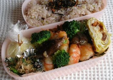 ***今日のお弁当***えびとシイタケとブロコリーの中華炒めハンバーグソース入り卵焼き小松菜のすりごまおかかあえチーズポテトボールひじきちりめん(明太子高菜味)************************えびは殻をとり背わたを取って片栗粉と水少量を加えてよくもみ洗いします。片栗粉にえびの汚れが移ったら水が透明になるまで何度もゆすぎ、きれいになったら水気をキッチンペーパーでしっかりふき取り軽く塩をしておきます。前の夜にここまで準備をしておきます。えびは食べやすい大きさに切り片栗粉をまぶしておきます。ブロッコリーは塩少々入れた熱湯でサッと茹で水気を切っておきます。シイタケはそぎ切りにします。サラダ油を熱したフライパンにえびを入れて1分ぐらいずつ両面に焼き色がつくよう蓋をして焼きます。焼き色がついたらシイタケ、ブロッコリーを加えて炒め中華だし、塩、こしょうで味付けしました。昨日のお弁当のハンバーグソースを取り分けておいて卵焼きに使いました。ハンバーグソースを温め直してあら熱をとっておきます。卵に塩、牛乳少量を加えてよく混ぜハンバーグソースが真ん中になるよう巻き込んで卵焼きにしました。小松菜は熱湯でサッと茹で、食べやすい長さに切り、しっかり水気を切り、しょうゆ少々をかけて混ぜしばらく置きます。しばらくするとしょうゆが水っぽくなるのでキッチンペーパーで軽く押さえるようにしてふき取り新たにしょうゆを足して、砂糖少々、すりごま、かつお節であえました。じゃがいもは薄くスライスして塩を入れて茹で、水気を切って、粉ふきいも状態にします。スライスチーズをちぎって加え、じゃがいもをつぶしながら混ぜ、塩で味を整え、ラップで包んで茶巾絞りにしました。