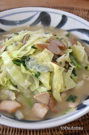 12月29日の1人のお昼ご飯は博多長浜とんこつラーメン。小ちくわ、たっぷりキャベツ、小ネギで具はた〜〜〜っぷり2人前。
