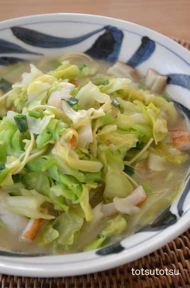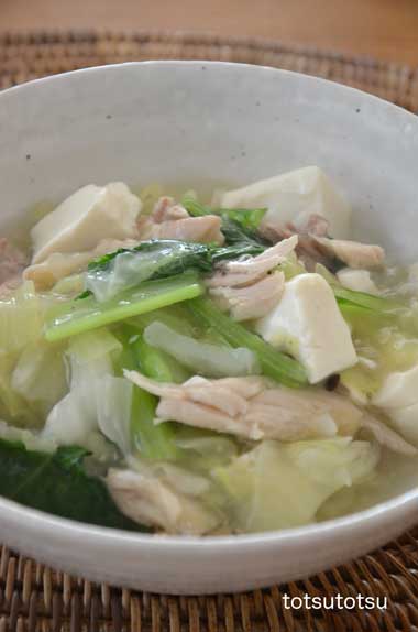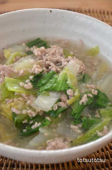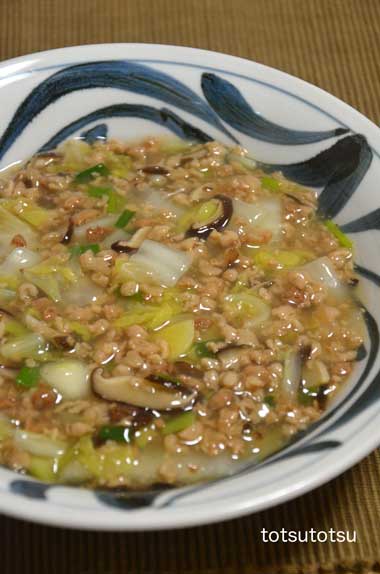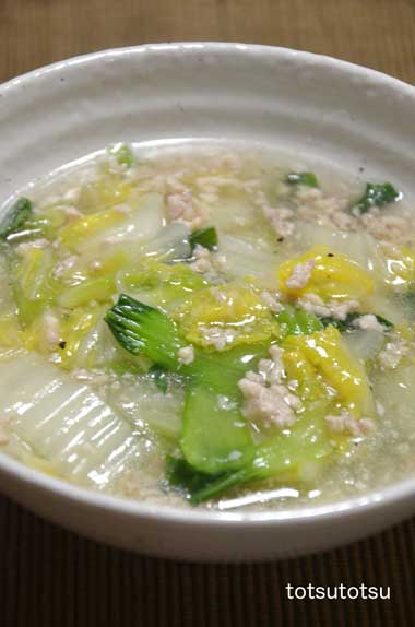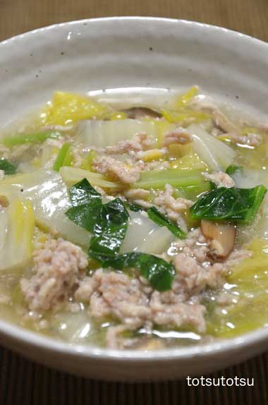 12月12日の1人の夜ご飯は鶏ひき肉と白菜のトロッと煮のスープ風。鶏ひき肉、た〜〜っぷりの白菜、チンゲンサイで。水分を少し多めにして水溶き片栗粉でとろみをつけました。