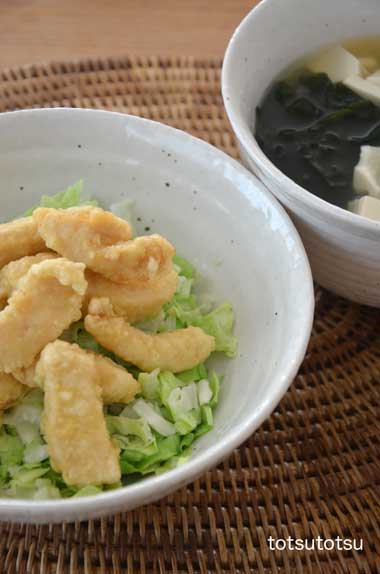 12月18日の1人のお昼ご飯はとり天丼。あごふりだしでワカメと豆腐のお吸い物といっしょに。雑穀米のご飯は70g。豆腐は150g。ご飯の上にはレンジでチンしたたっぷりのキャベツをのせて。