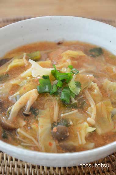 12月28日の1人の夜ご飯は大豆ミートと白菜のスープ。肉のかわりに大豆まるごとミートのミンチタイプを使ってヘルシースープ。大豆まるごとミート、たっぷりの白菜、スライス干し椎茸、ねぎ。水溶き片栗粉でとろみをつけました。