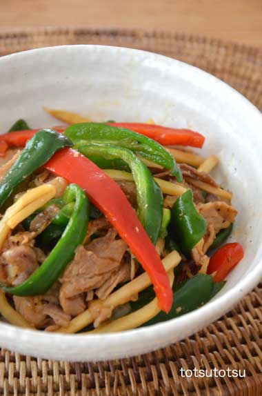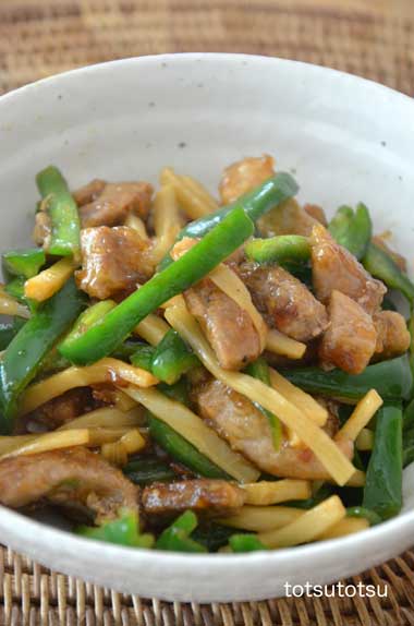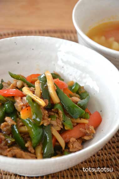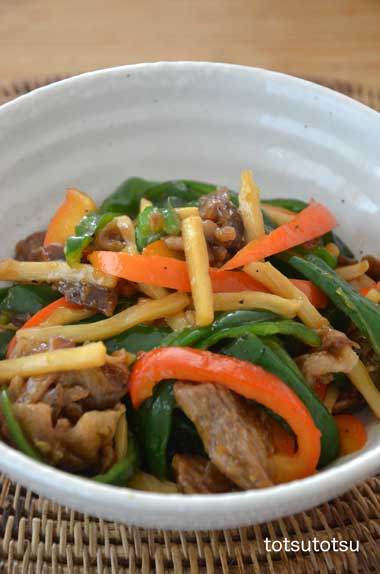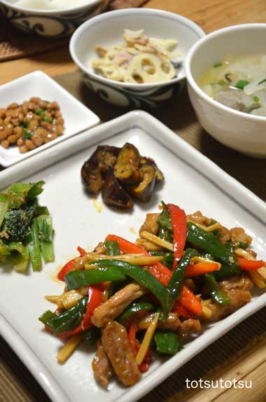 12月23日の夜ご飯のメインは青椒肉絲。青椒肉絲はちょっと厚めの豚肉とピーマン、パプリカ、細切りタケノコで。青椒肉絲、ナスの食べるラー油炒め、小松菜のごまあえ、あごふりだしで大根とスライス干し椎茸とイワシのつみれのお吸い物、レンコンとハムのサラダ、納豆、大根の甘酢漬け。