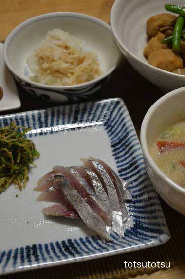 12月17日の夜ご飯のメインは鯵の刺身。鯵の刺身、豆苗のごまあえ、豆乳豚汁、鶏団子と鶏肉と根菜の甘辛煮、大根とホタテ貝柱のサラダ、納豆、大根の甘酢漬け。大根とホタテ貝柱のサラダは細切り大根に塩をしてちょっとおいて水気をしぼり、ホタテ貝柱の缶詰を汁ごと入れてマヨネーズといっしょにあえて、塩と粗挽き黒コショウで味を整えるだけのかんたんレシピです。
