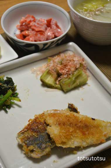 12月18日の夜ご飯のメインは揚げない鯵マヨフライ。マヨネーズを塗ってパン粉をつけてフライパンで。油で揚げないのでヘルシーです。揚げない鯵マヨフライ、レンジなすのおかかポン酢、ほうれん草のごまあえ、サーモンとトマトのサラダ、エノキと白菜と鶏ひき肉のスープ、豆腐、大根の甘酢漬け。