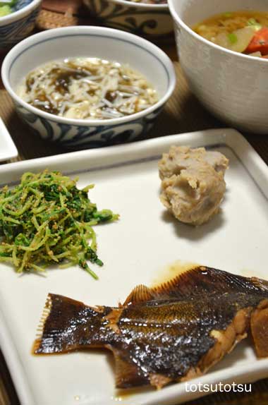 12月15日の夜ご飯のメインはカレイの煮つけ。カレイの煮つけ、里芋の味噌煮、豆苗のごまあえ、豚汁、エノキ入りもずく酢、豆腐、きゅうりの甘酢漬け、イカ明太子。