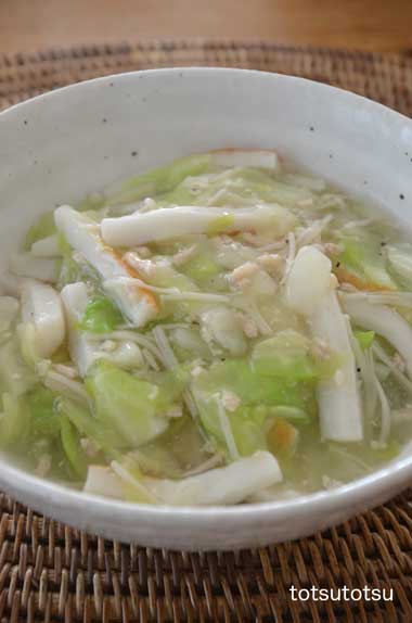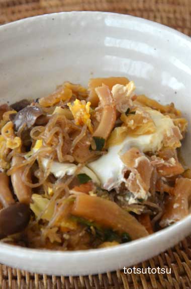 12月19日の1人のお昼ご飯は中華丼。前日の白菜とエノキと鶏ひき肉のスープの残りを使って。雑穀米のご飯は70g。白菜とエノキと鶏ひき肉のスープの残りにはたっぷりのキャベツと小ちくわをプラスして。具はた〜〜っぷり2人前、おかわりしていただきました。