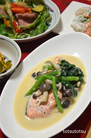 12月25日の夜ご飯のメインは鮭のクリーム煮を豆乳で。今年は24日も25日もダンナも娘も家ご飯。なので25日の夜もちょっとクリスマス風に・・・でも手抜きで。鮭のクリーム煮、カボチャとクリームチーズのサラダ、ホタテとエビのサラダ、ローストビーフと野菜のサラダ。鮭のクリーム煮は豆乳で作るのでヘルシーです。ほうれん草、ブナしめじ、インゲンを添えました。カボチャとクリームチーズのサラダは茹でたカボチャにkiriのクリームチーズとマヨネーズを少し混ぜただけのかんたんレシピです。ホタテとエビのサラダは買ったものをそのままで。ローストビーフと野菜のサラダは買ったものをベビーリーフにのせました。