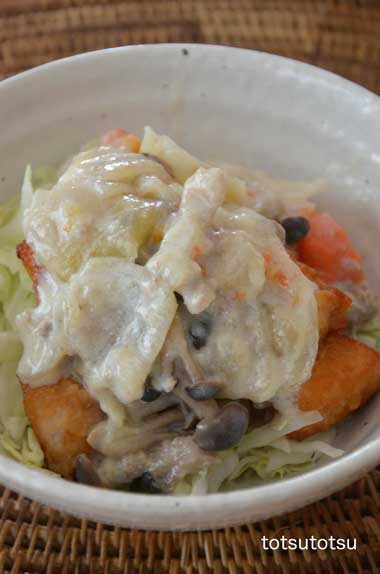 12月20日の1人のお昼ご飯は唐揚げシチュー丼。冷凍唐揚げに前日の残りの豆乳シチューをかけました。雑穀米のご飯は70g。レンジでチンしたキャベツをのせて。