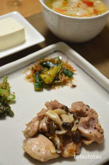 12月14日の娘と2人の夜ご飯のメインは鶏もも肉のガーリック炒め。ガーリック炒めは桃屋のきざみニンニクを使い、ブナしめじといっしょに。味付けは塩と粗挽き黒こしょう。鶏もも肉とブナしめじのガーリック炒め、小松菜のごまあえ、食べるラー油でキュウリとちりめんじゃこのジャッと炒め、具だくさんのミネストローネ、豆腐。