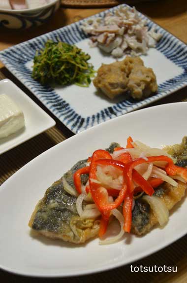 12月11日の夜ご飯のメインはアジの南蛮漬け。アジは揚げずにフライパンで焼きました。味付けはミツカンのカンタンいろいろ使えま酢と麺つゆで。アジの南蛮漬け、里芋の味噌煮、レンコンとハムのサラダ、豆苗のごまあえ、豆腐、大根の甘酢漬け。