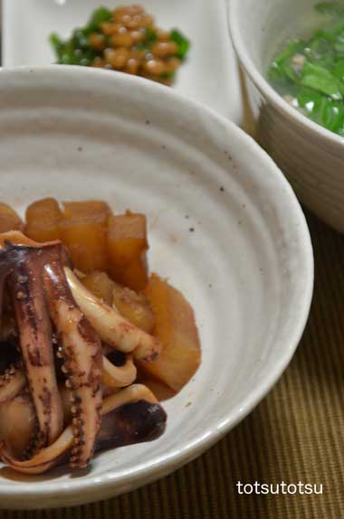 12月10日の1人の夜ご飯のメインはイカ大根。お昼ご飯の白菜と鶏肉のトロッと煮を取り分けておいてスープにしました。夕ご飯用にイカを買ったのにダンナも娘も夕ご飯いらないメール。仕方ないので1人でイカ大根。イカ大根、白菜と鶏ひき肉のスープ、納豆、大根の甘酢漬け。