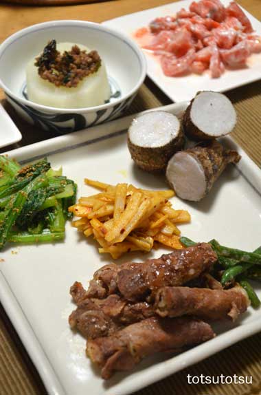 12月9日の夜ご飯のメインはエノキの豚肉巻き。エノキの豚肉巻き、レンコンの食べるラー油炒め、ほうれん草のごまあえ、里芋の蒸し煮、トマトとスモークサーモンのサラダ、ふろふき大根の肉味噌のせ、豆腐、大根の甘酢漬け。ふろふき大根はあごふりだしで煮ました。エノキの豚肉巻きは甘辛い味付けで、里芋の蒸し煮はちょっと塩をふっていただきました。