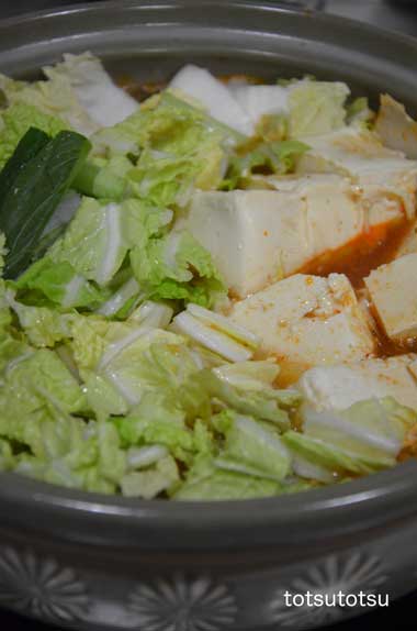 12月26日の娘と2人の夜ご飯はキムチ鍋。先日のダンナと2人のキムチ鍋の時、煮込むとキムチの赤い色が薄くなったので今回はキムチ鍋のもと+桃屋のキムチのもとで。具材は鶏薄切り肉、白菜、大根、小松菜、ブナしめじ、エノキ、豆腐で。豚肉がなかったので鶏の薄切り肉を使ったのですがやっぱり豚肉の方がおいしいですね。