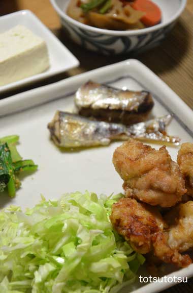 12月8日の夜ご飯のメインはとり天と唐揚げと鰯のオイル煮。夕方から娘の買い物につきあう約束だったので出かける前に鰯をオリーブオイルでコトコト煮ておきました。オイルサーディン風です。鰯が少なめだったのと帰宅してからの手抜きのために買い物終わりにデパ地下へ。そこで大分名物のとり天を発見。大分名物の唐揚げはいろんな所で売っているけど、大分名物のとり天は滅多にお目にかかりません。唐揚げよりはとり天の方が大大大だ〜〜〜い好きなので即購入です。唐揚げもちょっとおいしそうだったのでついでに購入。一緒に売られてたドレッシングも購入。とり天は塩で食べたりポン酢で食べたりすることが多いのですが、味見をしたら美味しかったので買っちゃいました。左の鬼のイラストは味曾味、右はトマト味。いろいろに使えそうです。とり天、唐揚げ、鰯のオイル煮、レンジでチンしたキャベツ、小松菜のごまあえ、根菜の煮物、豆腐、大根の甘酢漬け。カロリー、ちょっと気になる夜ご飯でした・・・が、大満足。美味しかった〜