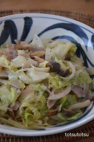 12月9日のお昼ご飯はベーコンとキャベツのクリームパスタを豆乳で。ベーコン、キャベツ、タマネギ、ブナしめじ、豆乳で。豆乳を使うのでホワイトソースを使うよりヘルシーです。粗挽き黒こしょうをたっぷりかけて。
