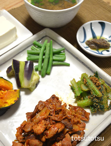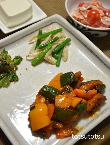夜ご飯のメインは豚キムチ。豚キムチ、ほうれん草の胡麻あえ、カボチャのソテー、ナス蒸し焼きとインゲンはバーニャカウダソースで、絹ごし豆腐、シジミのみそ汁。豚キムチの豚肉は油を入れずに豚肉から出る脂で炒め余分な脂も拭き取りマイルド味のキムチと炒めて桃屋の海鮮キムチの素をプラスしました。カボチャは少量のオリーブオイルで炒めました。今夜もお米無しの夜ご飯です。